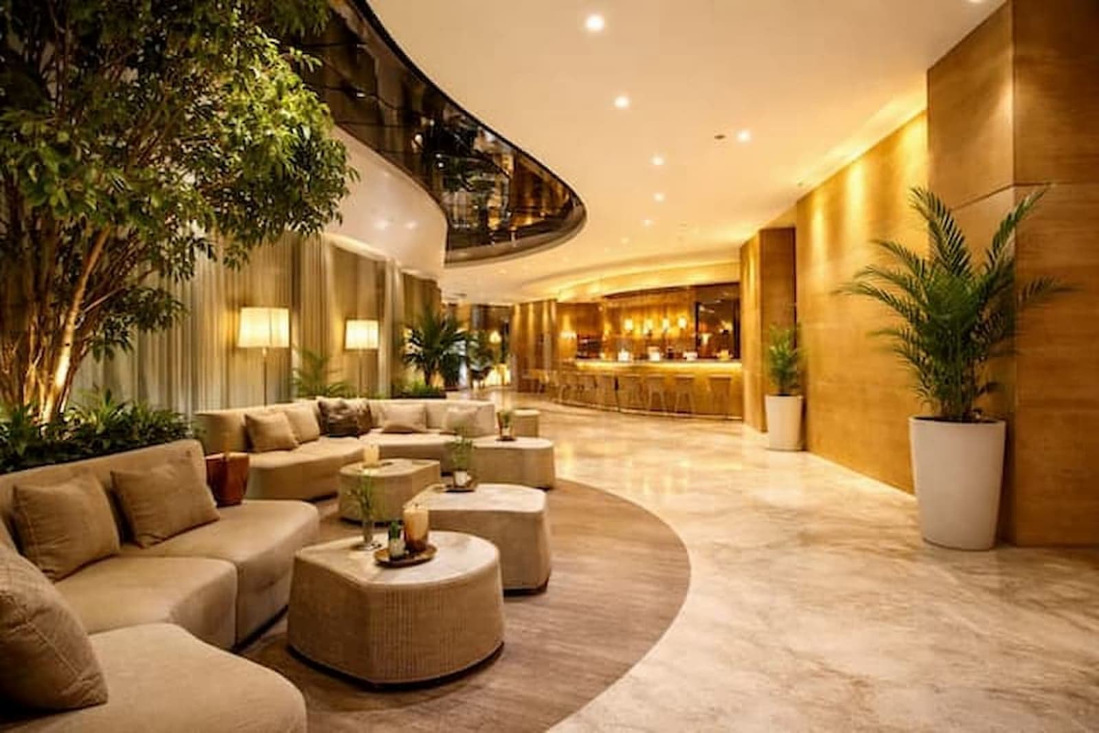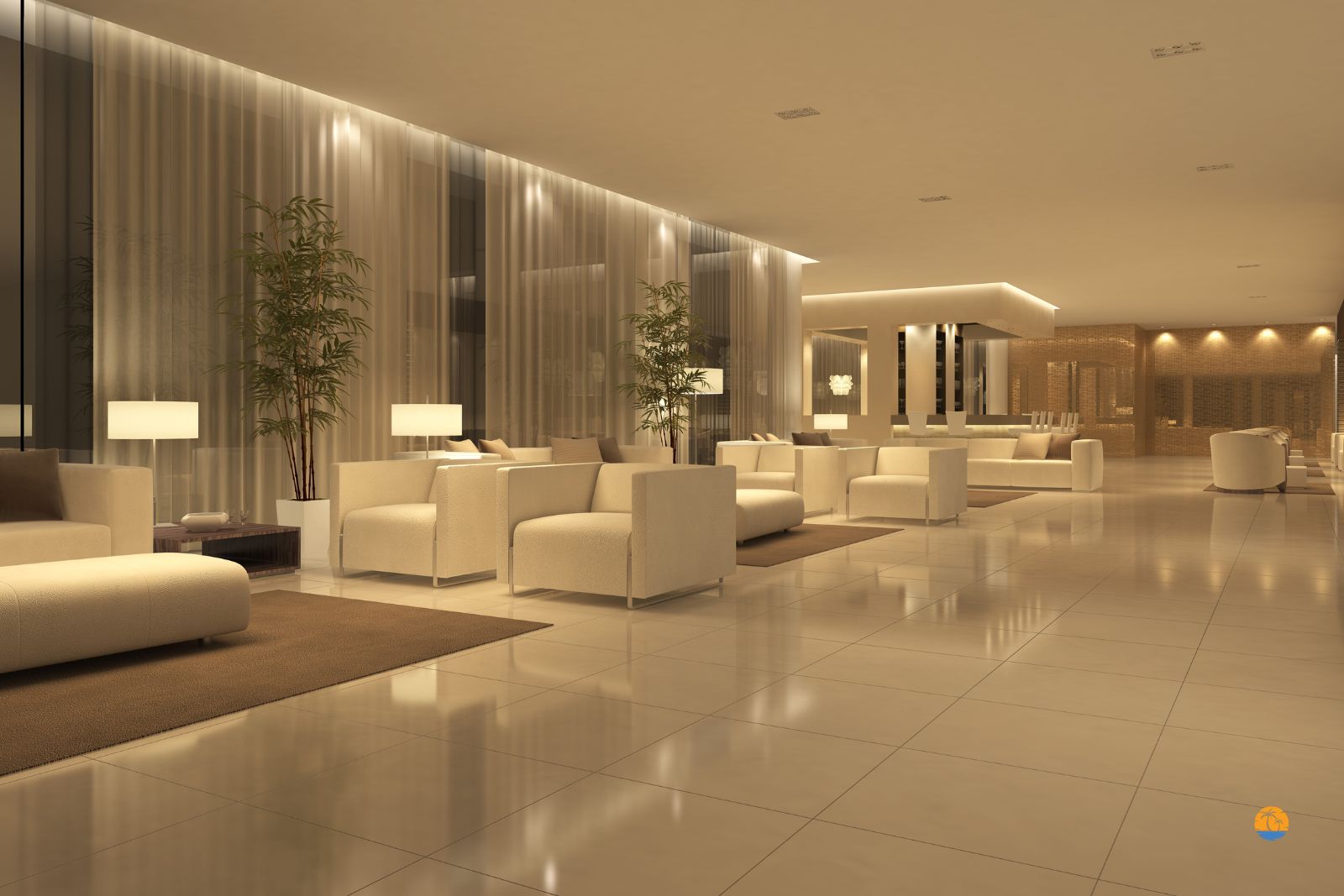 Przestronne lobby hotelowe w jasnych barwach z nowoczesnymi sofami i oświetleniem Hotelowa recepcja z zielenią i drewnianymi akcentami, otwarta przestrzeń ze stolikami Główne lobby hotelu z marmurową podłogą i łukowymi wejściami w klasycznym stylu Przestronne lobby hotelowe w jasnych barwach z nowoczesnymi sofami i oświetleniem