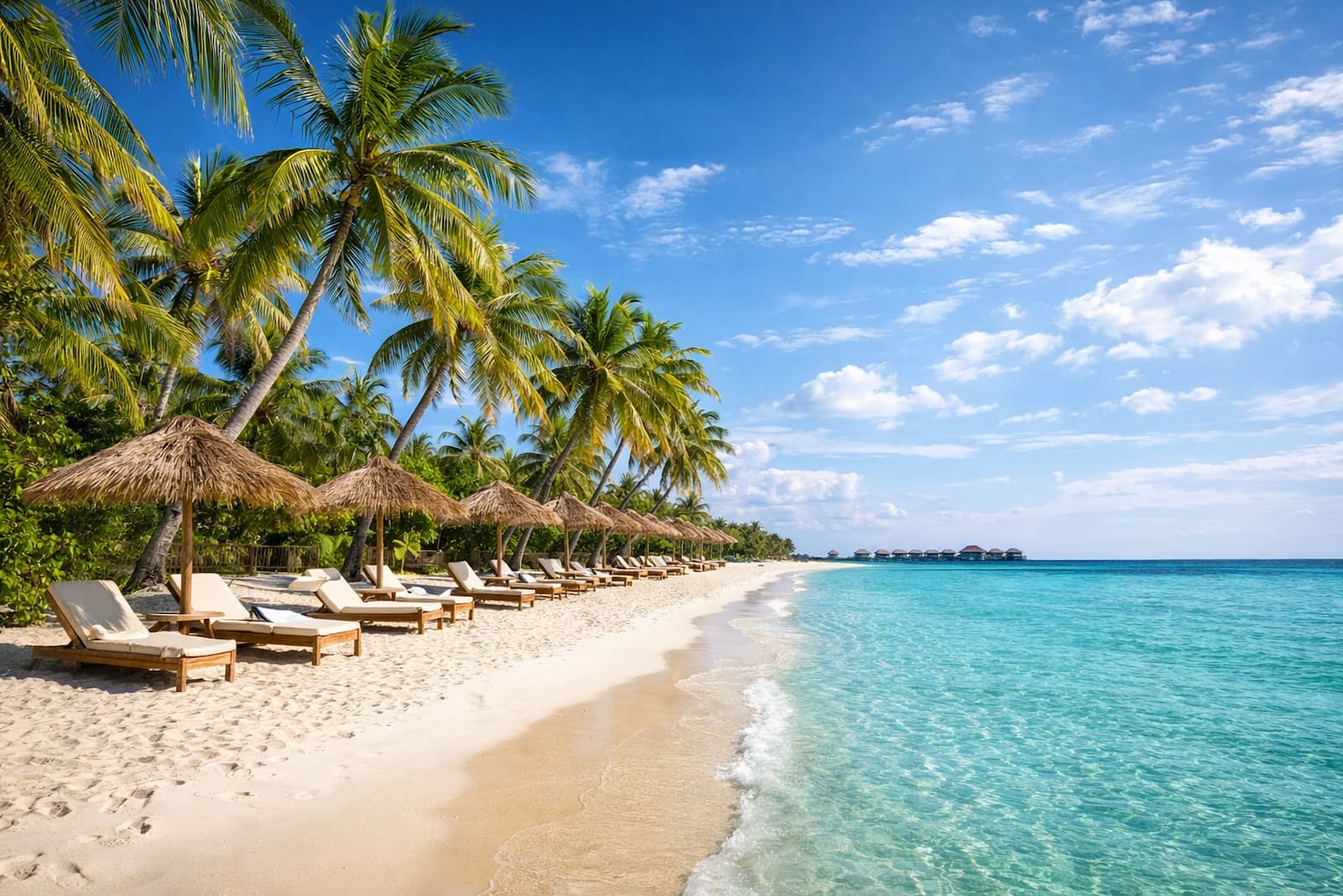 Hotelowy basen z widokiem na palmy i błękitne niebo w tropikalnej okolicy Tropikalny ogród z palmami i alejkami wzdłuż hotelowych budynków Drewniane domki na palach nad turkusową wodą w egzotycznej okolicy Hotelowy basen z widokiem na palmy i błękitne niebo w tropikalnej okolicy