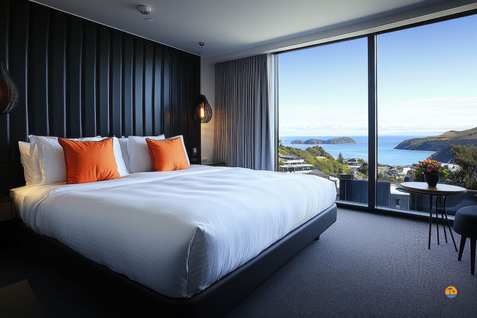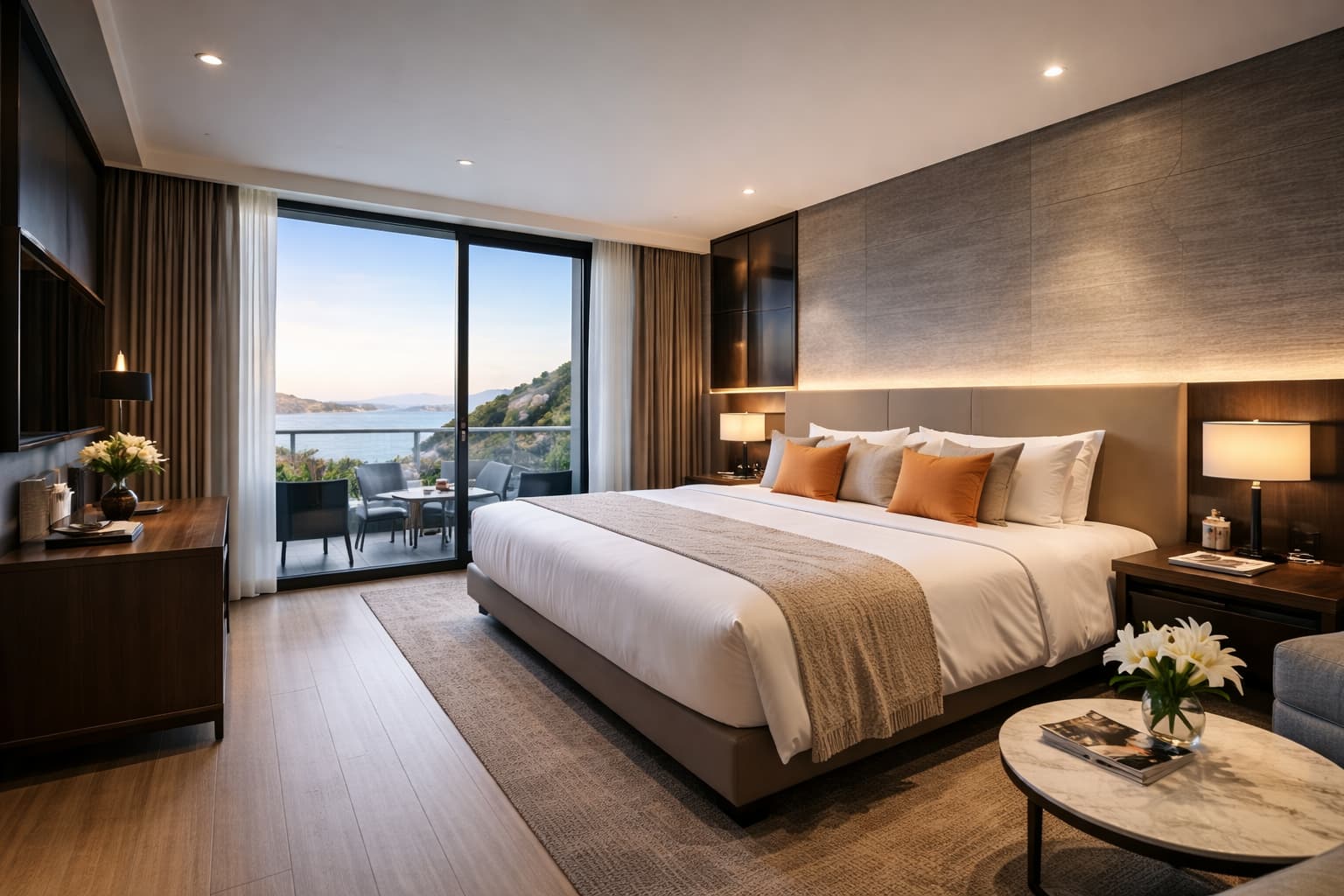Pokój hotelowy z dwoma łóżkami, jasną podłogą i dużym oknem z zasłonami Nowoczesny pokój hotelowy z łóżkiem typu king-size i panoramicznym widokiem na morze Pokój hotelowy z biurkiem, laptopem i strefą wypoczynkową w ciepłym oświetleniu Pokój hotelowy z dwoma łóżkami, jasną podłogą i dużym oknem z zasłonami
