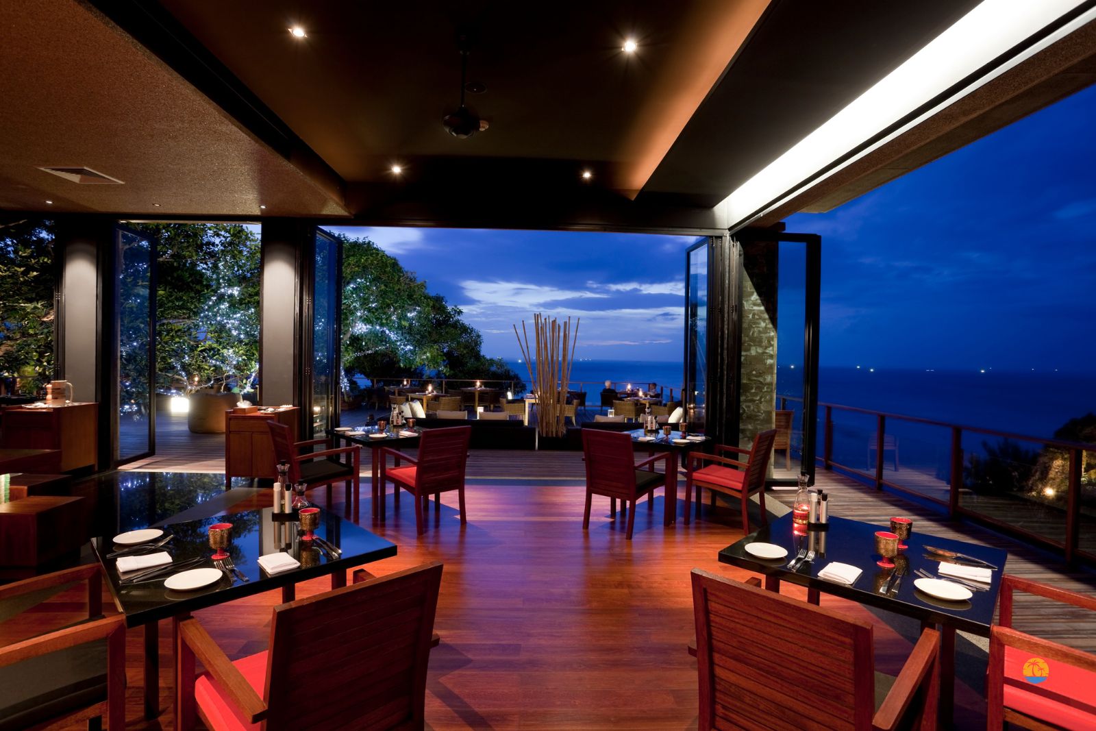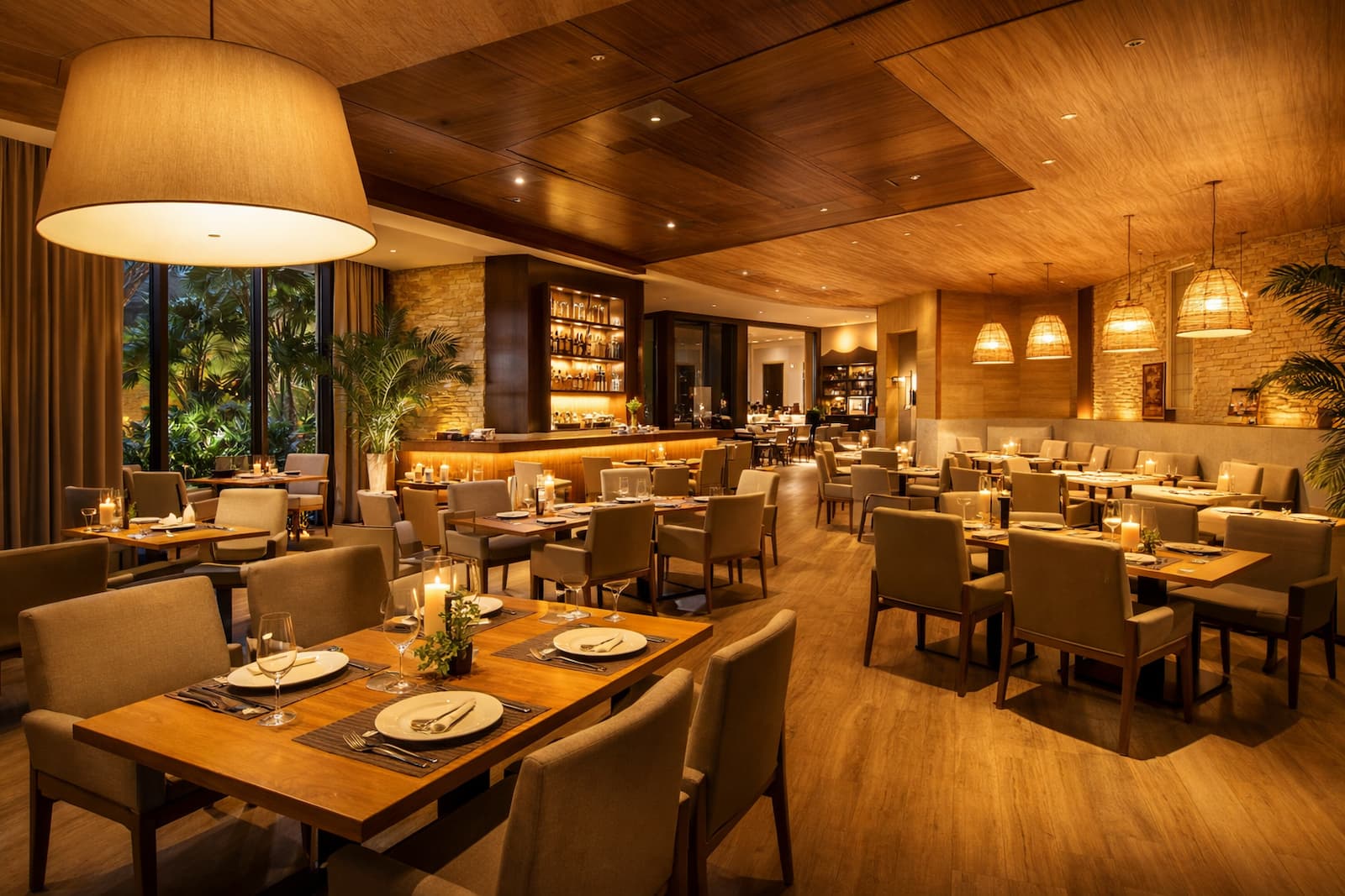 Elegancka restauracja hotelowa z miękkim oświetleniem i złotymi zasłonami na suficie Restauracja z tarasem i widokiem na morze, ustawione stoliki przy zachodzie słońca Jasna restauracja hotelowa z roślinami i nowoczesnym wystrojem w ciepłych barwach drewna Elegancka restauracja hotelowa z miękkim oświetleniem i złotymi zasłonami na suficie