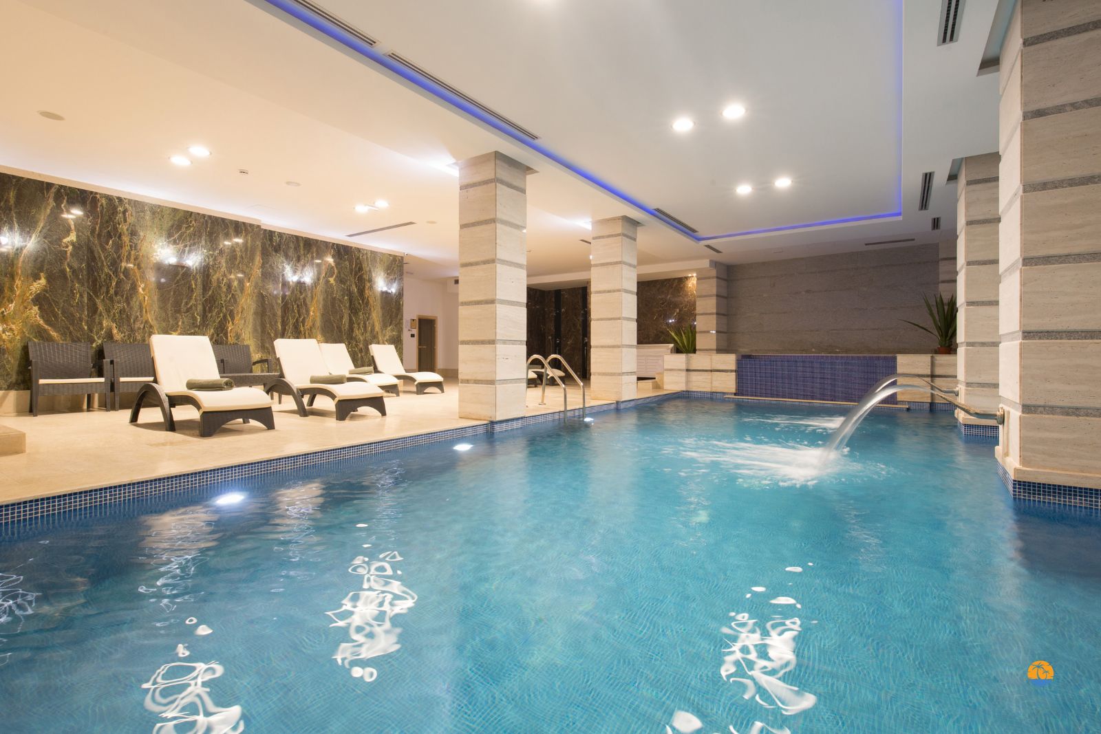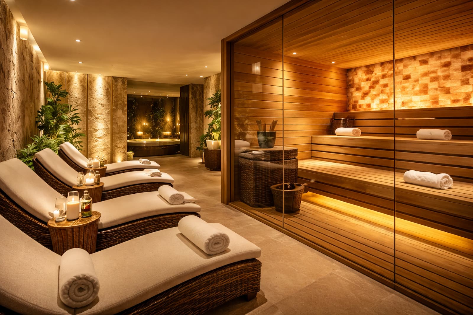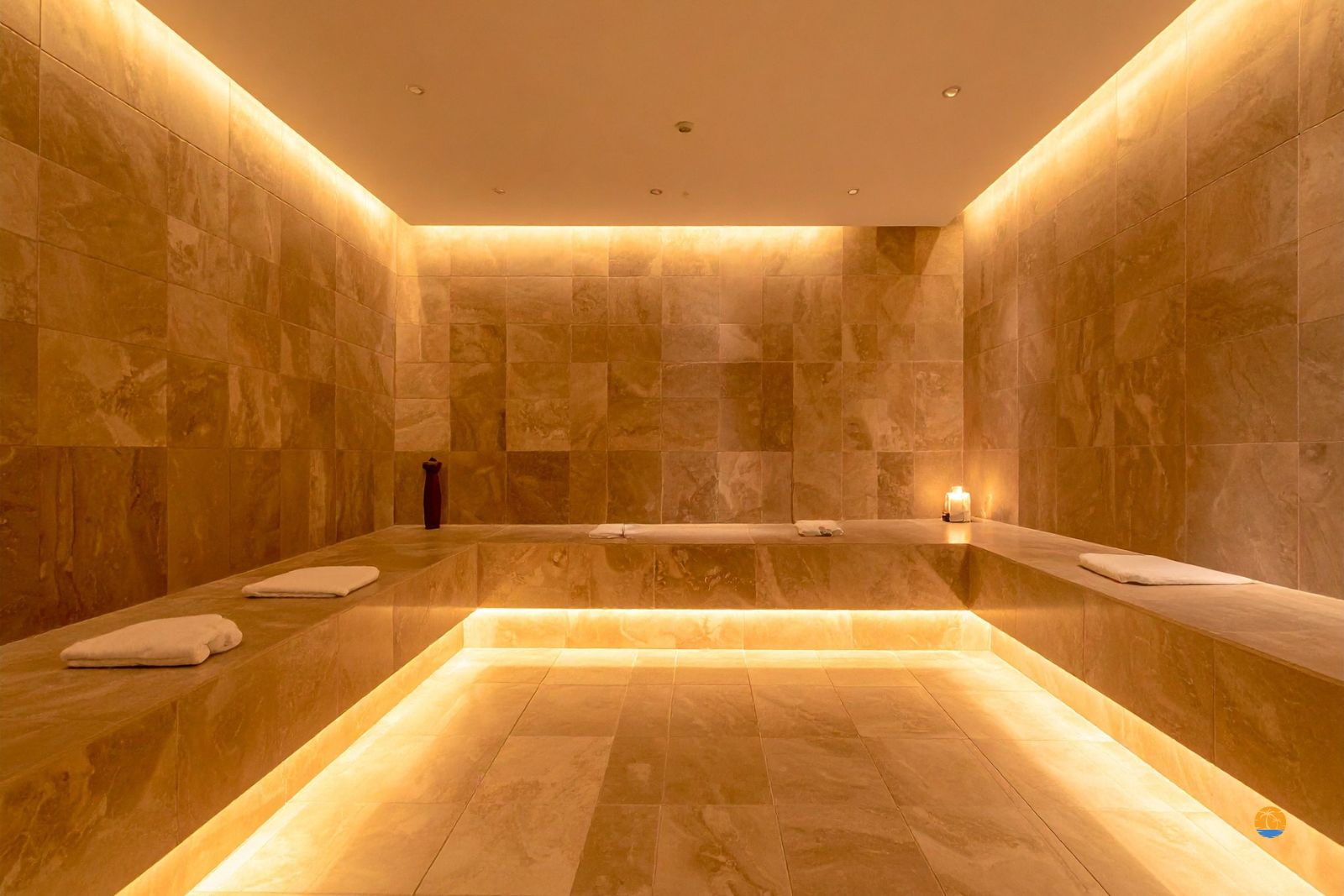 Łaźnia parowa z kamiennymi ścianami i ciepłym oświetleniem LED Luksusowa strefa spa z jacuzzi i podświetlanymi łukami w kamiennej aranżacji Nowoczesny kryty basen z leżakami i subtelnym oświetleniem sufitu Łaźnia parowa z kamiennymi ścianami i ciepłym oświetleniem LED